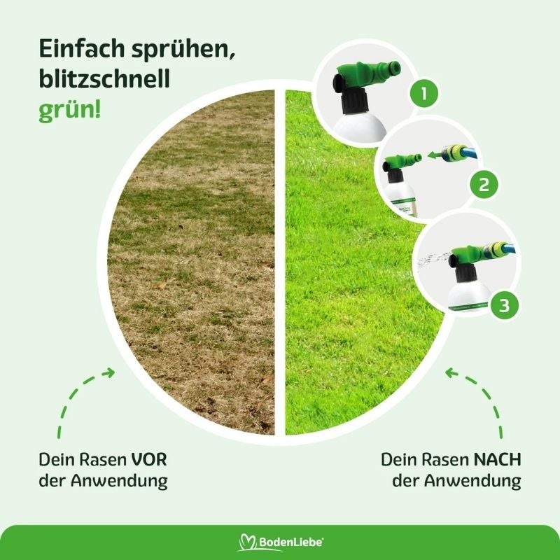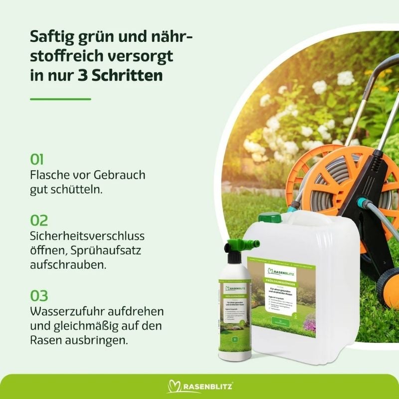Sprühkopf auf die Flasche, Gartenschlauch anschließen, Wasserhahn aufdrehen und gleichmäßig über den Rasen sprühen. Das dauert ca. 3 Minuten für 250 m². Kein Streuwagen, keine Handschuhe, kein Knien.